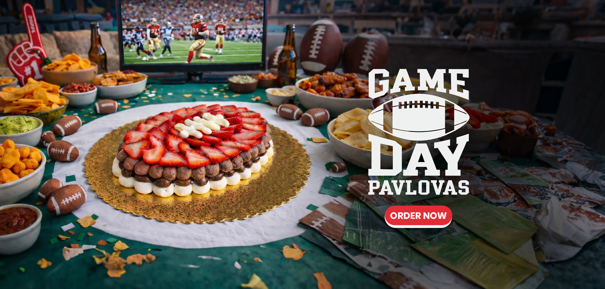 Limited game day pavlovas available for The Big Game!. Designed for watch parties, photos, and winning spreads.